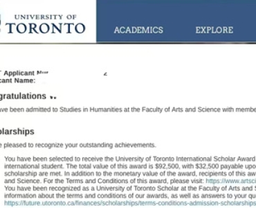 一早上传来好消息,世界名校,加拿大第一名多伦多大学录取一枚,最难得的是一...
